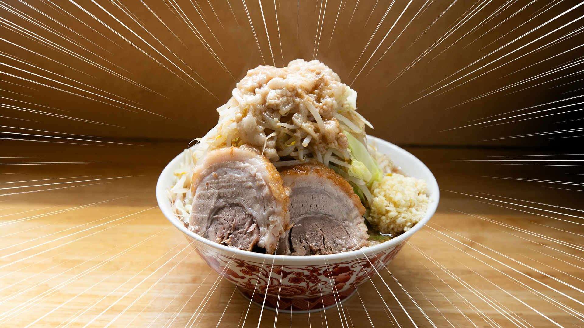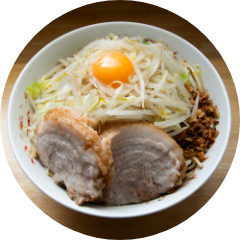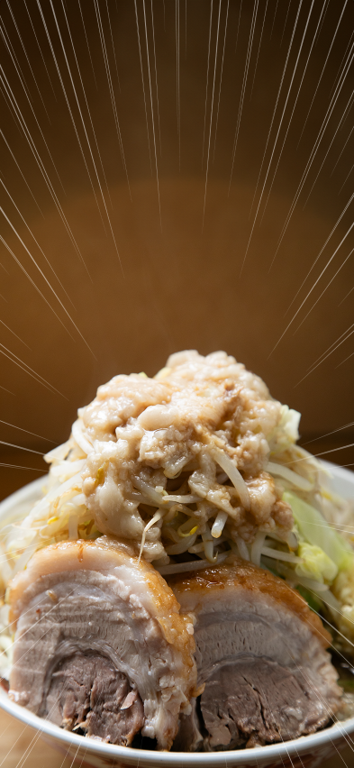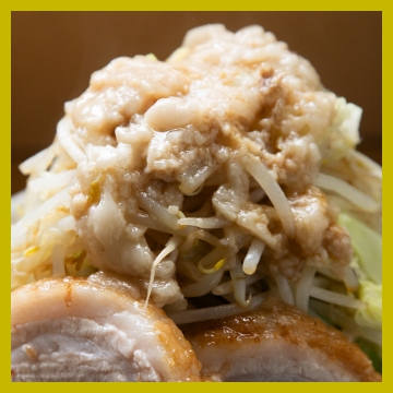 丼には麺を覆い尽くすほどのモヤシとキャベツが山盛りに、そしてニンニクやアブラなどのトッピングをお好みでコール。さらに有料のトッピングを追加すれば、自分好みの最強の一杯に!